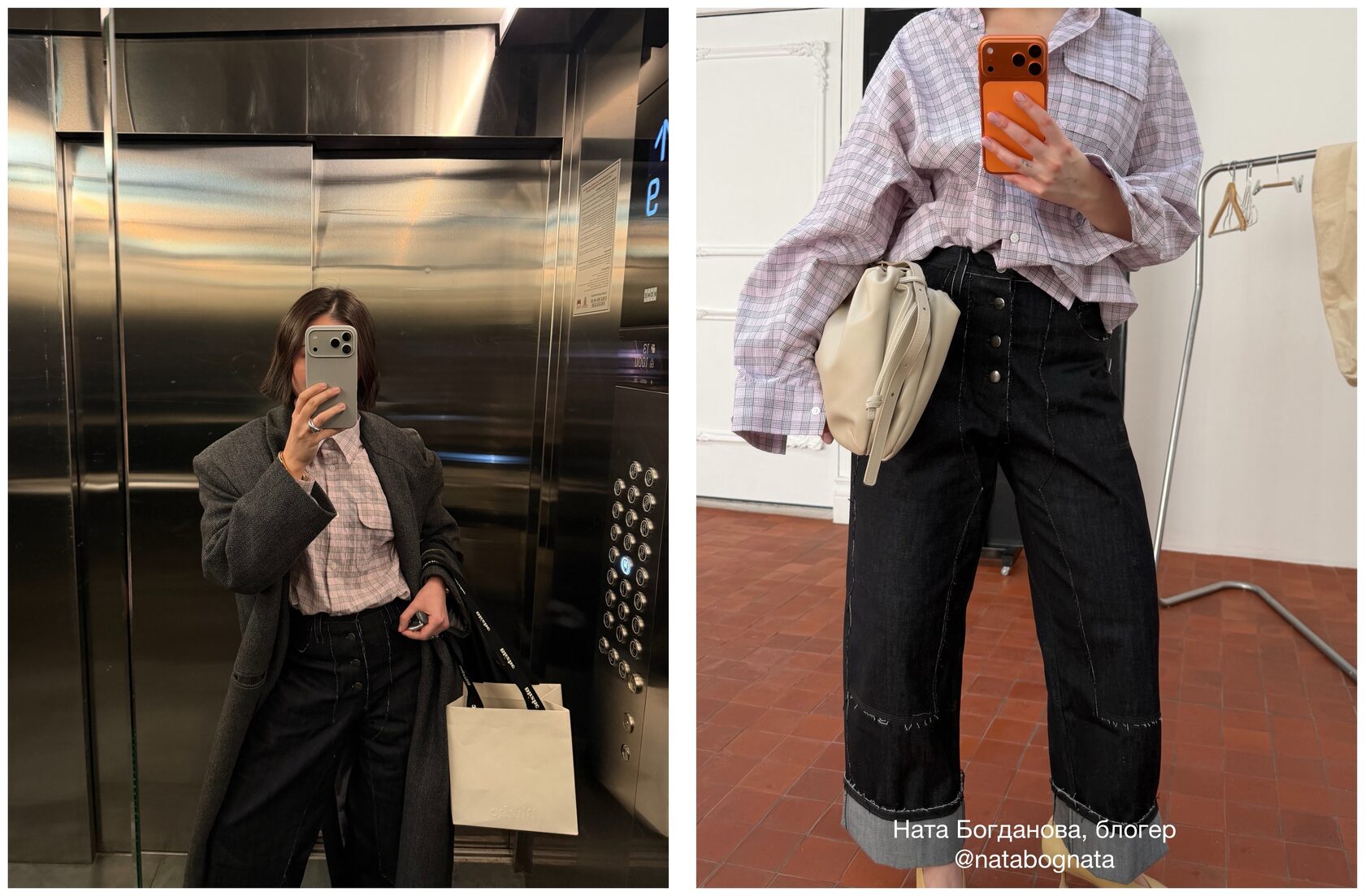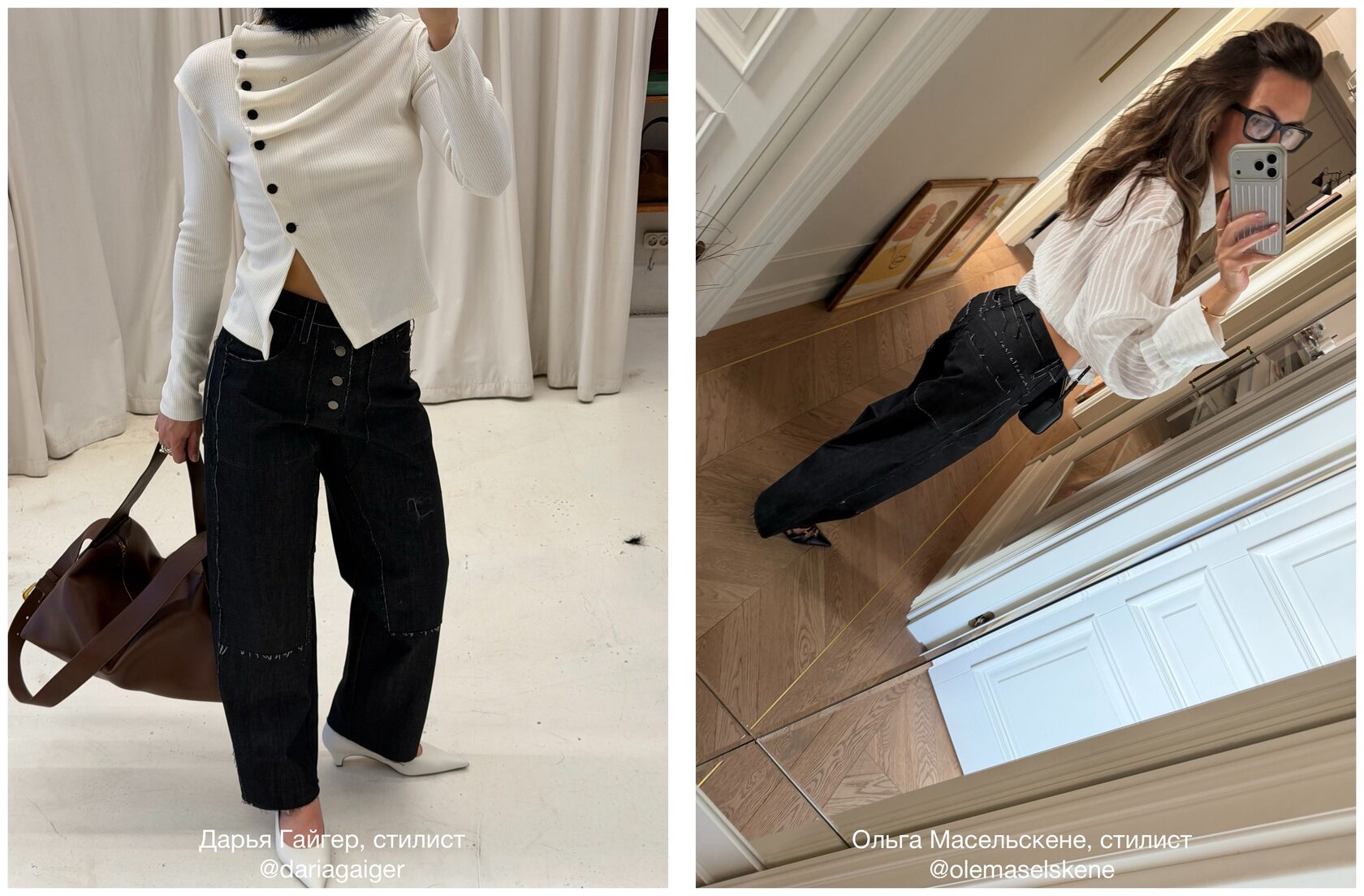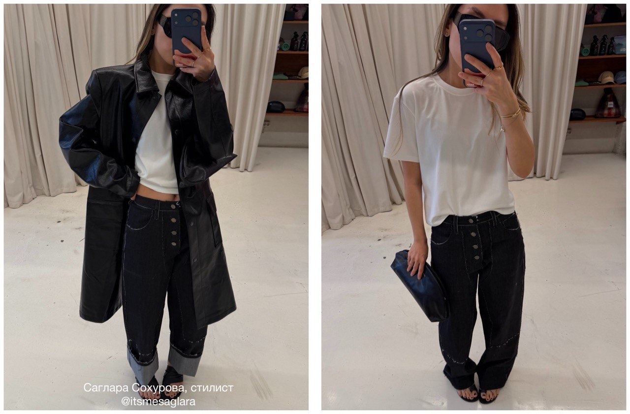 Джинсы изготовили из мягкой, тянущейся джинсы. Силуэт штанин немного напоминает ковбойские штаны и задуманы так, чтобы они держали форму, которая может добавить объем от бедра и ниже. Оставили декоративные детали и карманы необработанными, могут осыпаться в процессе носки. Рекомендуем подрезать ножницами по мере осыпания.