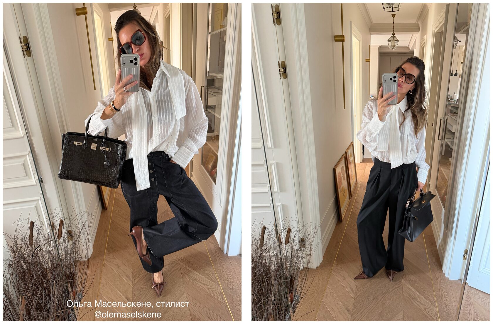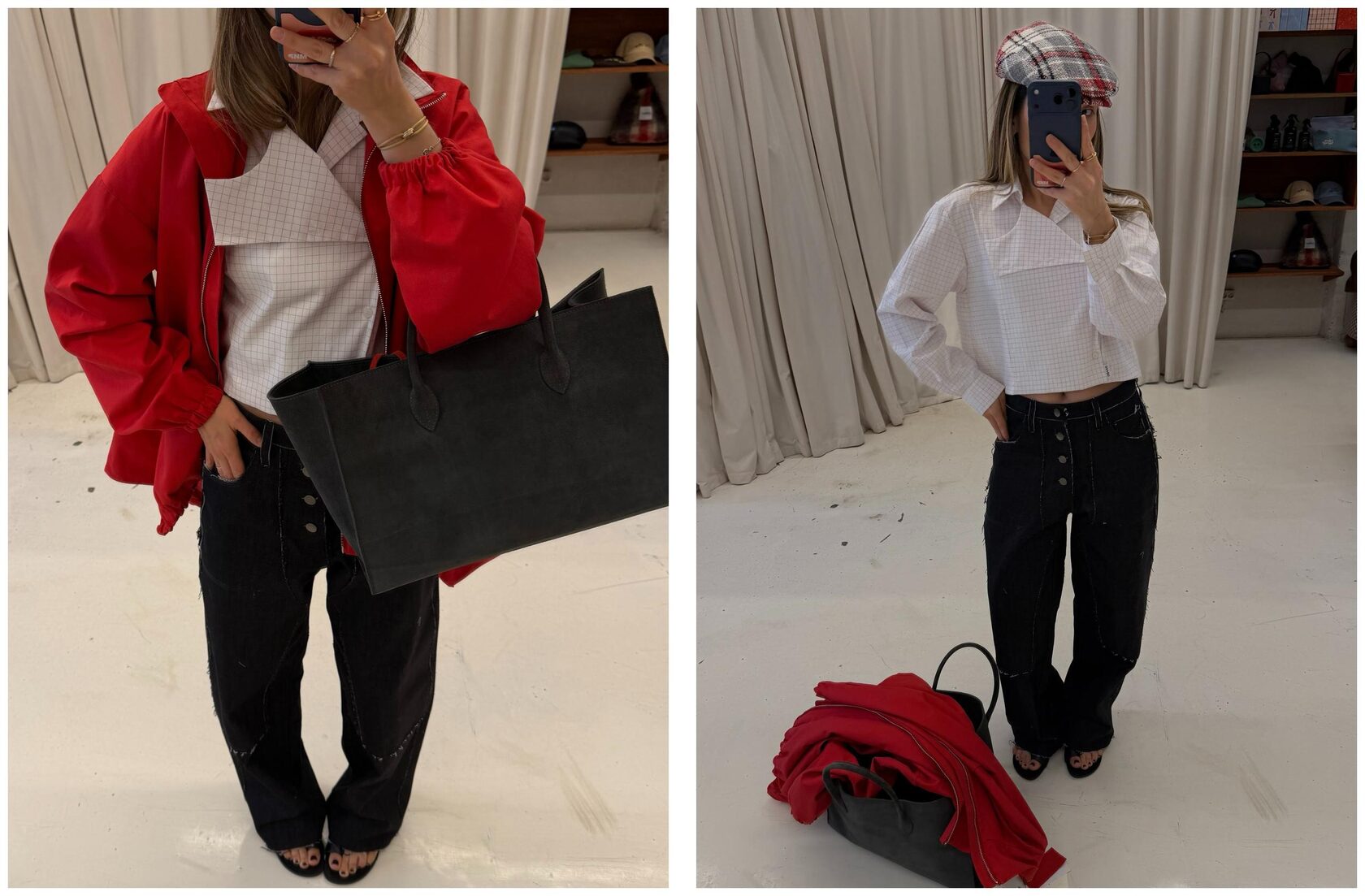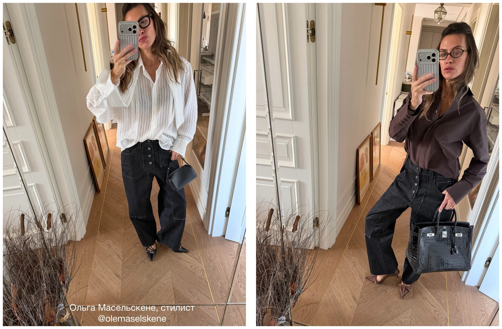 Джинсы изготовили из мягкой, тянущейся джинсы. Силуэт штанин немного напоминает ковбойские штаны и задуманы так, чтобы они держали форму, которая может добавить объем от бедра и ниже. Оставили декоративные детали и карманы необработанными, могут осыпаться в процессе носки. Рекомендуем подрезать ножницами по мере осыпания.