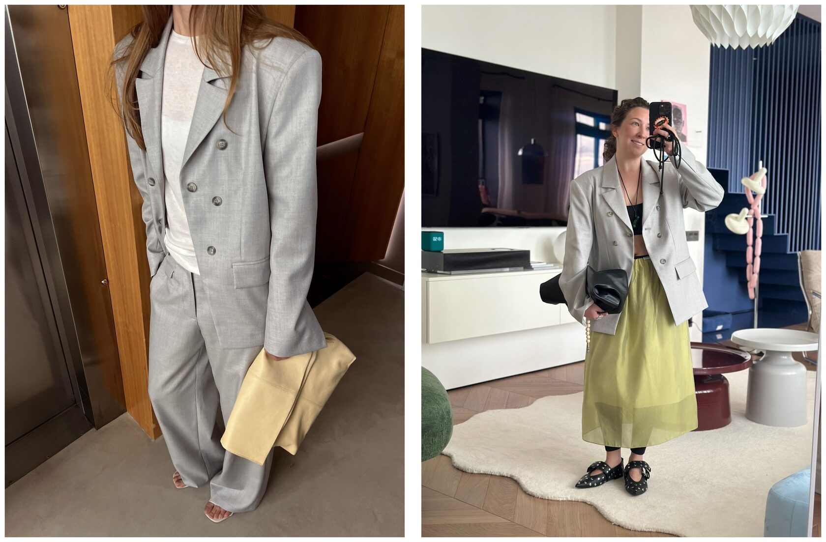 Фигурный жакет с декоративными пуговицами. Расположение застежки позволяет носить жакет как первый и единственный слой в теплое время года. Ткань с легко выраженной льняной фактурой придает воздушности образу.